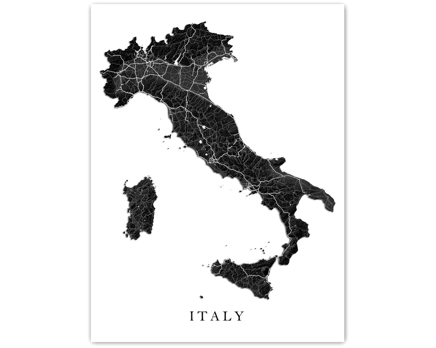 Italy Map Print Poster, Black and White Topographic Italy Country